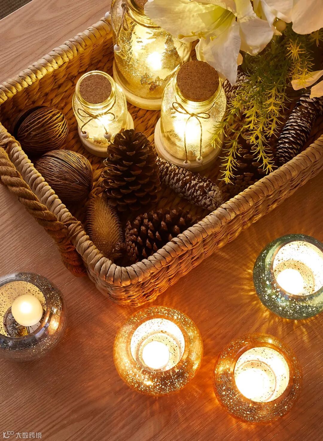 金色烛光之下,一部电影、一杯红酒......总让人浮想联翩,带来美好回忆,在桌子上摆上几只金色系的器皿、咖啡杯、果盘、干果盘、烛台...让空间更加精致迷人。