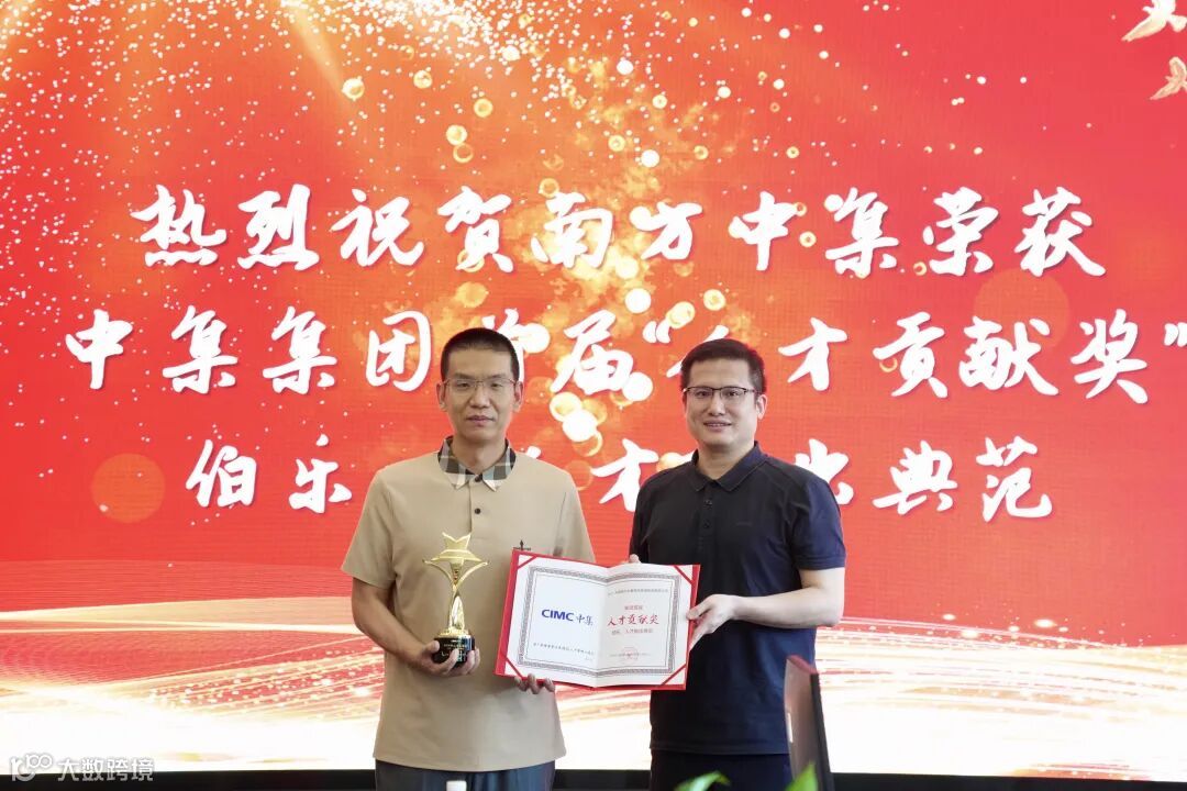 在颁奖慰问环节,贺瑾代表中集集团向东莞南方中集送来了集团首届“人才贡献奖——伯乐、人才输出典范”荣誉证书及奖杯。