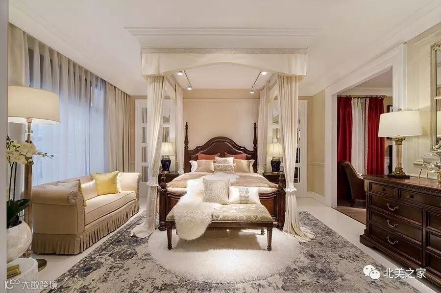北美生活讲求实用、务实精神,对家中卧室的第一要求即是舒适温馨,有助于身心迅速放松。温润的樱桃色实木与米棕色柔软布艺沙发、软装极致结合,整个卧室空间以温馨典雅的暖调为主,没有多余的缀饰,视觉简洁高雅,流露出奢华而沉稳的气息,令人心生宁静。