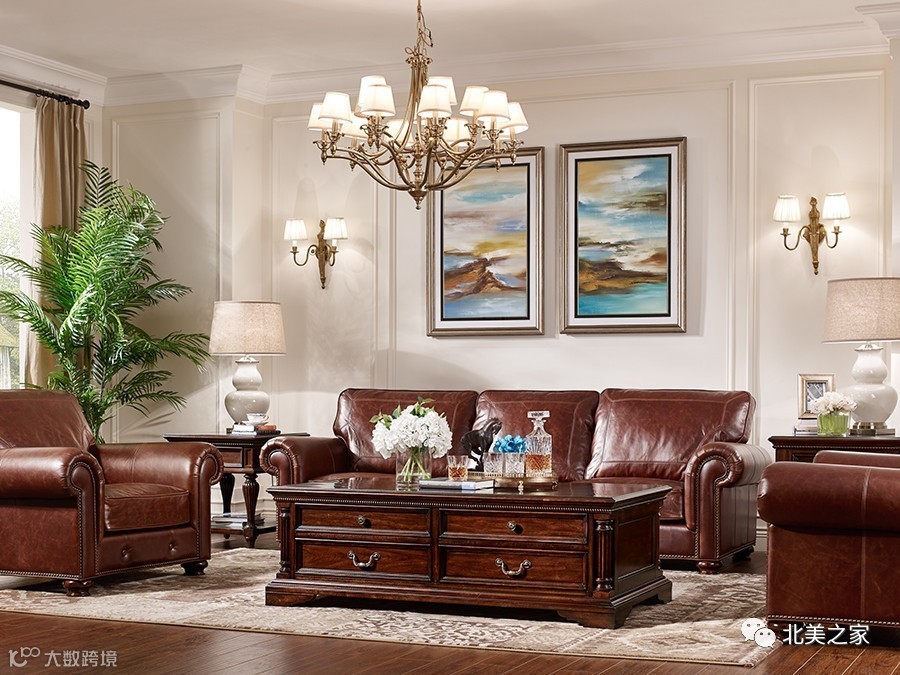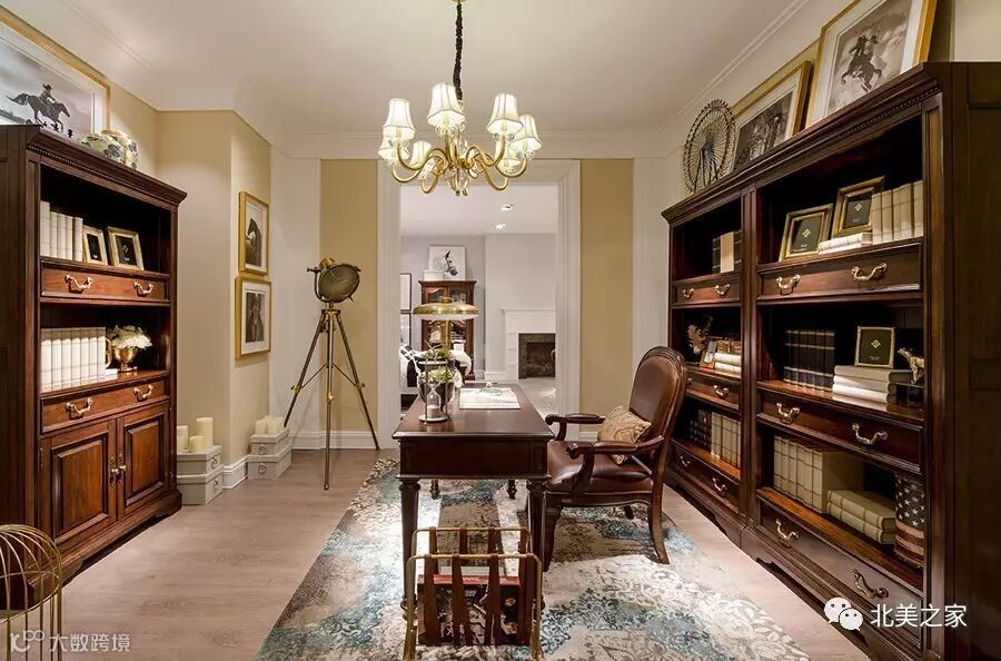 经典美式以深厚的文化底蕴著称,注重有历史感、文化气息的营造,这不仅体现在经典美式家具的全实木结构、艺术化的形体构造以及沉稳的用色上,还反映在整体空间氛围的塑造上。