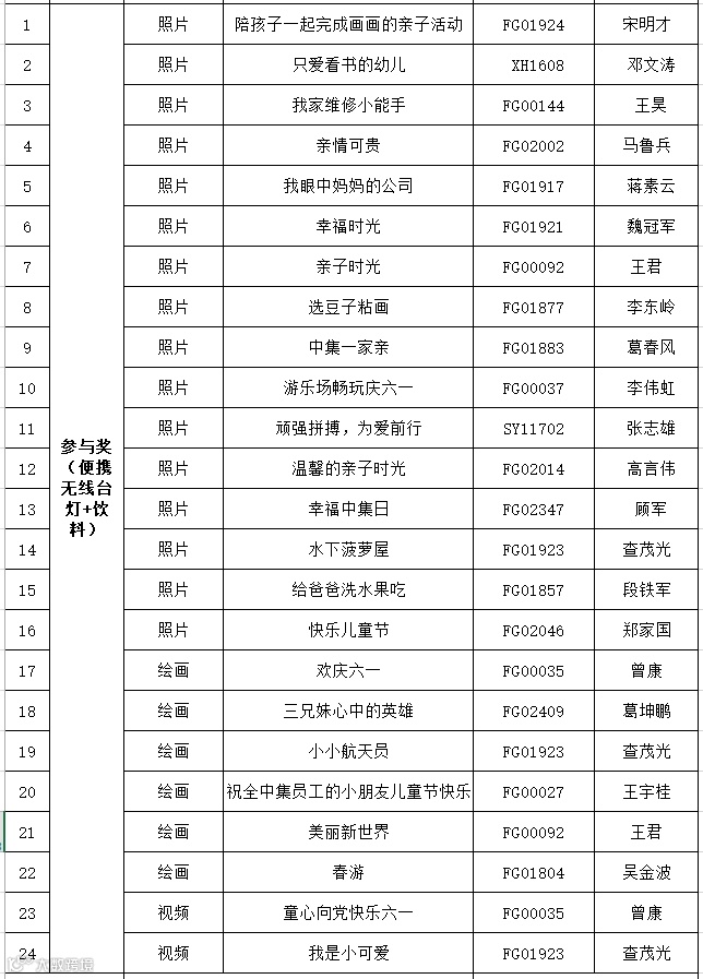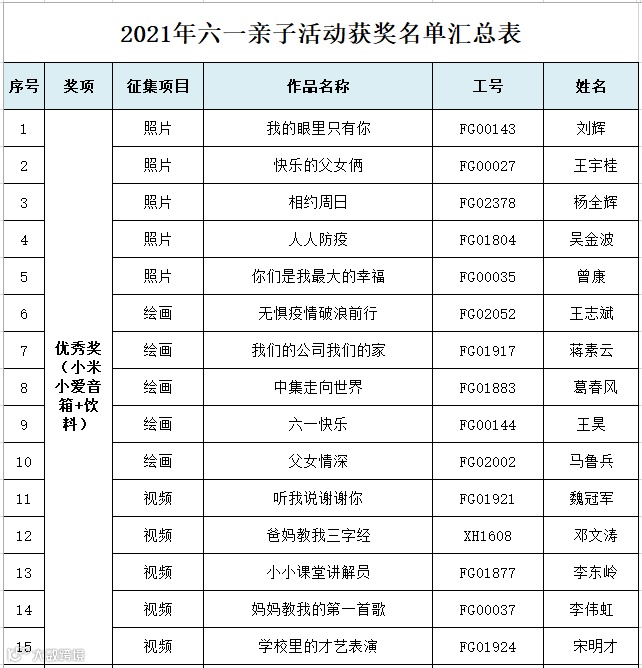 经过相关部门评委们认真、严格的评审,对亲子照片、亲子绘画和亲子视频各评选出5幅优秀作品。在今天六一儿童节到来之际,现对评选结果及获奖人员名单公布如下: