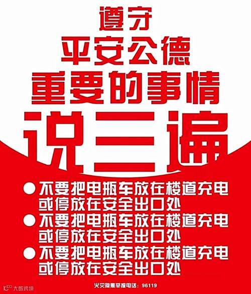 提示:不在楼梯间、过道或者房间室内充电,消除安全隐患。