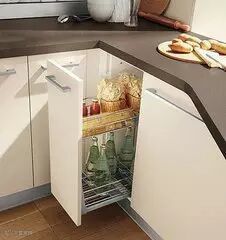 有些橱柜会设有拉篮或抽屉,它们的储物空间比较大,而且空间分配的也合理,如果没有设置它们,厨房的一些小物件可能不方便存放,而且在橱柜的拐角处就能设置,使空间利用率最大化。