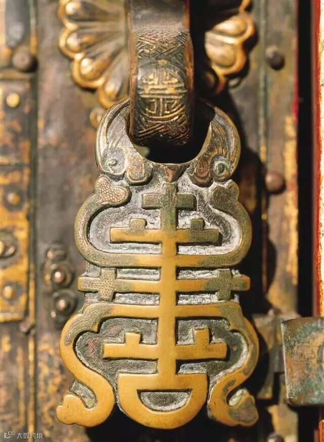 ▲箱扣,“套住”幸福和长寿。箱扣以“福”、“寿”文化题材的最为普遍。组合起来就有“百年和合,福寿双全”等吉祥寓意。“百年和合”是指一生和睦同心及一帆风顺,“福寿双全”是指幸福长寿。扣底部配上圆形如意云纹饰件,寓意是福寿连绵。