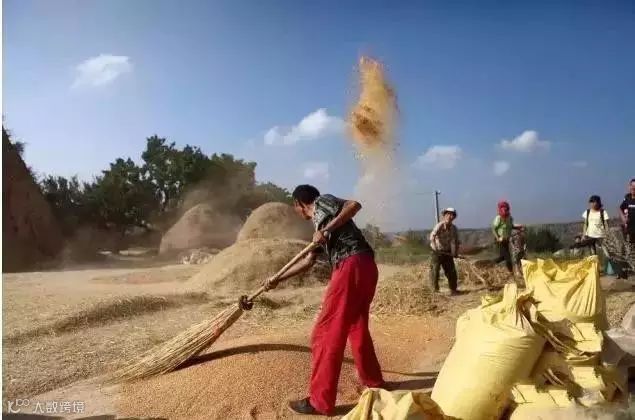 用木掀把轧下来的麦粒迎风抛向空中,
