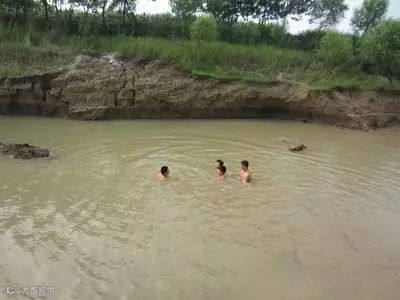 一到傍晚就有孩子偷偷来玩水了,