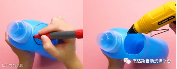 材料和工具:洗衣液瓶、塑料瓶、针、打火机、记号笔、热熔胶、剪刀