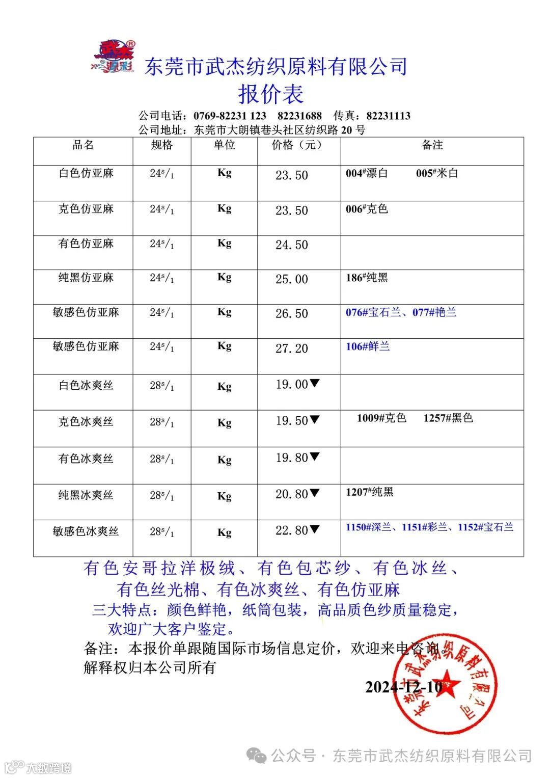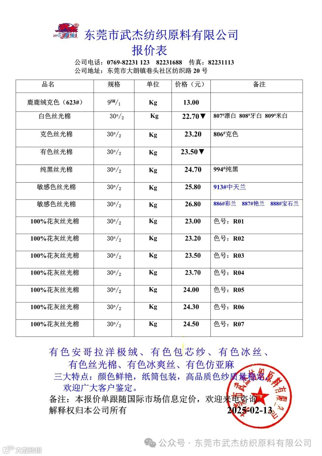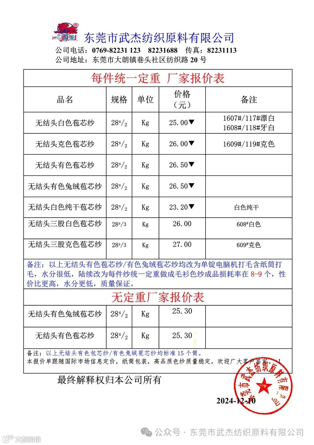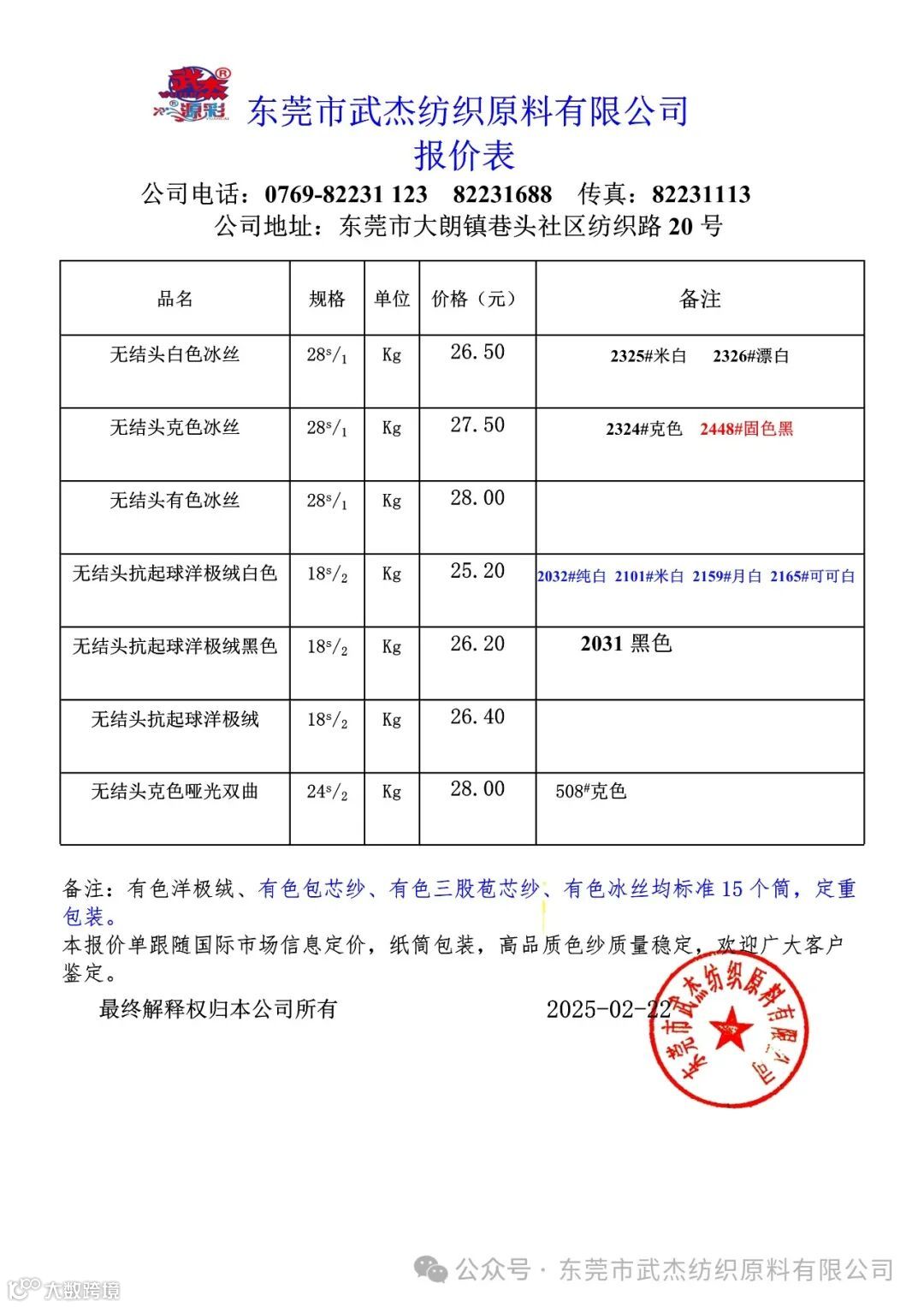 东莞市武杰纺织原料有限公司尊敬的广大客户: