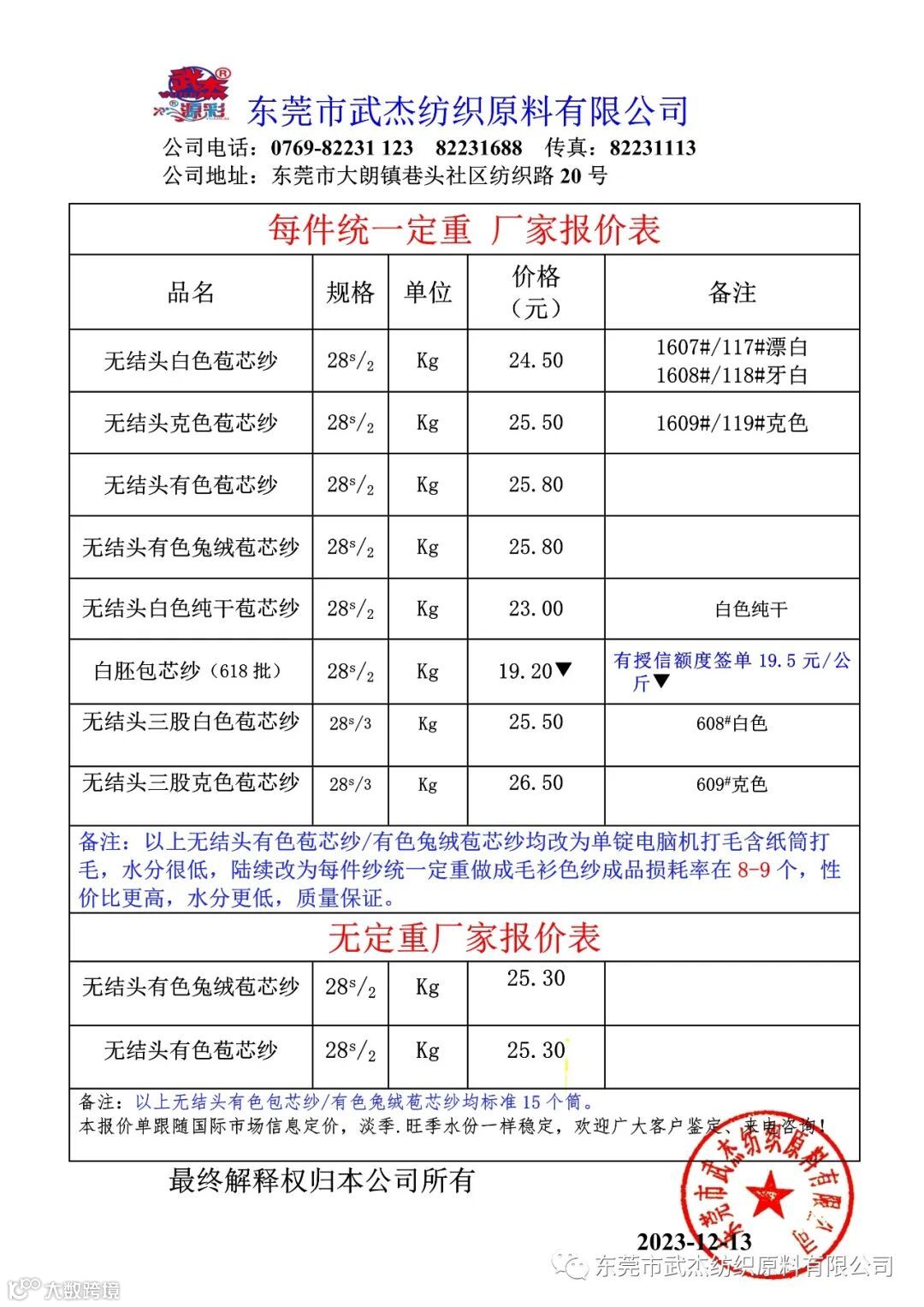 包芯纱系列除均改为单锭电脑机打毛外,每件纱统一净重25公斤。