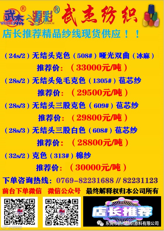 无结头三股白色苞芯纱在原基础价格上调500元/吨(三股克色价格暂时不变)