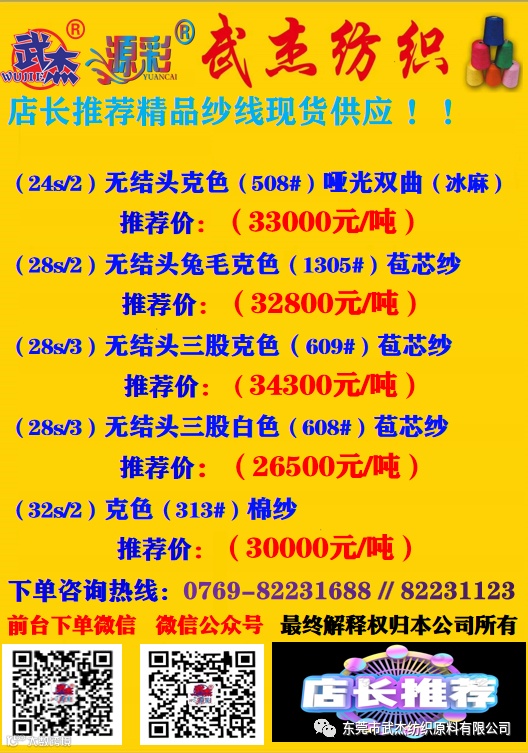 我司无结头(仿兔含高弹)苞芯纱色纱含克色及白色均在原基础价格下调500元/吨