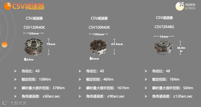 针对具身智能发展趋势,领益智造通过对自研CSV减速器(摆线针轮减速器)不断优化迭代,开发出扭矩比谐波大、寿命长的小尺寸摆线针轮减速器,并应用于具身智能机器人。其中,CSV72R48G实现传动比48、额定扭矩16Nm、瞬时最大容许扭矩56Nm、角传递误差≤120arc.sec、齿隙≤3arc.min、效率代表值85%的同时,重量仅为0.48kg。