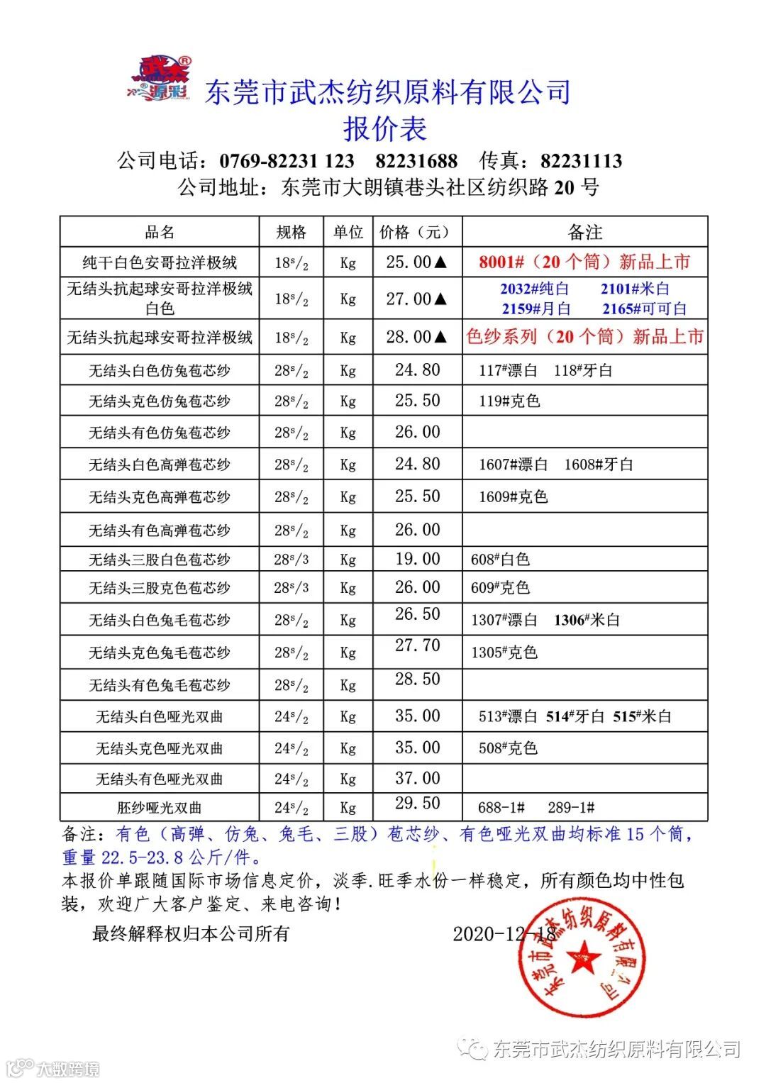 因近期(腈纶)原料涨价厉害,2020年12月18日起对以下产品价格做出调动:
