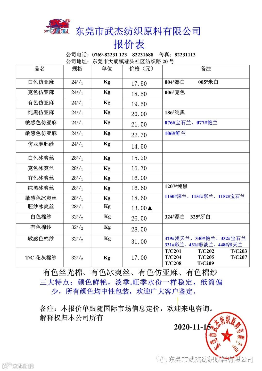 本公司微信公众号报价表已同步更新欢迎大家关注,我司三染厂加足马力生产,四络筒厂加班赶货,货源充足,优惠多多欢迎大家来砸单!