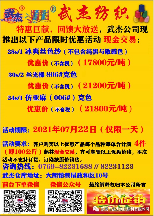 导读:特惠巨献,回馈大放送 武杰公司现推出以下产品限时优惠活动 仅限2021年07月22日一天,现金交易 欢迎大