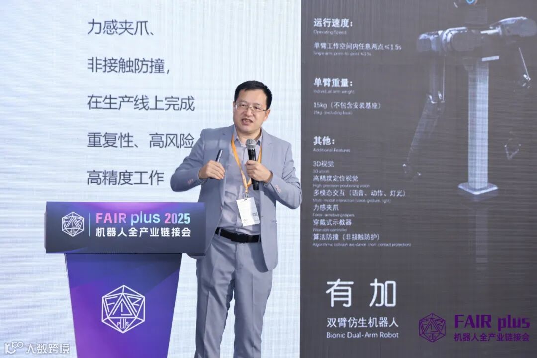 公司自动化负责人兼领鹏智能总经理谭军先生详细介绍了公司研发生产的多款机器人核心产品,并着重展示了公司研发生产的双臂仿生机器人“有加”。