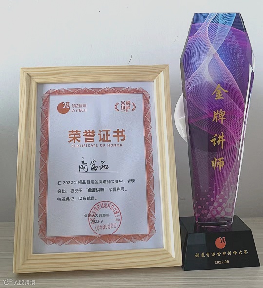 在集团举办的金牌讲师大赛中,商富品代表黄江冲压参赛,并取得了第一名的好成绩!荣获“金牌讲师”称号!