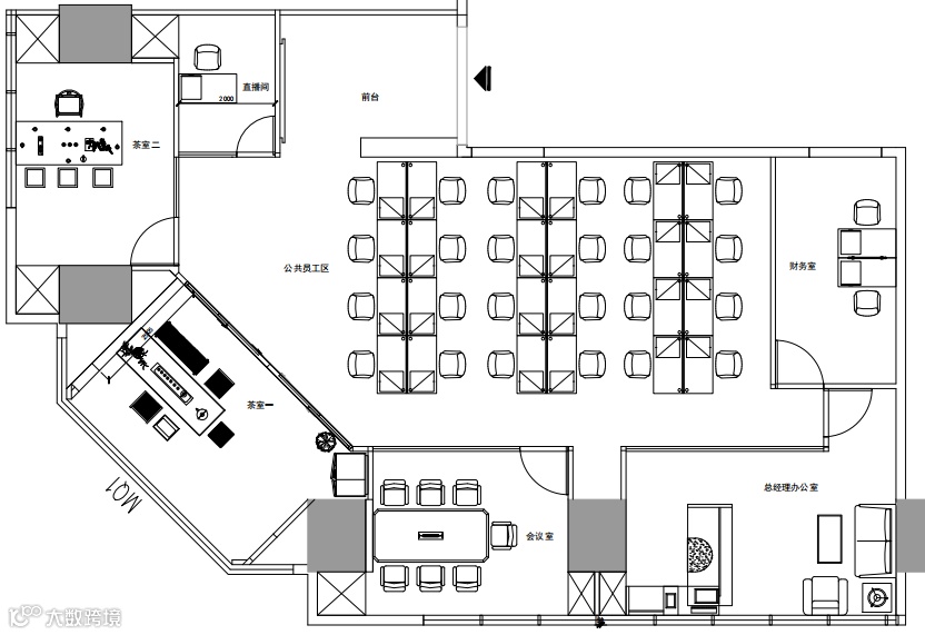 空间描述:前台+员工区+总经理+财务室+会议室