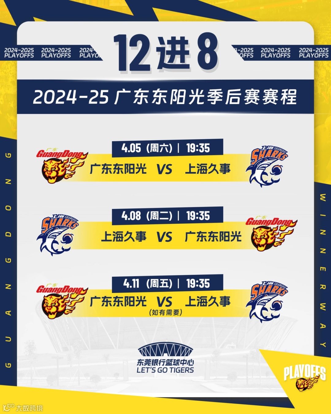 CBA季后赛12进8采用三场两胜制,主客场设置为1-1-1,广东东阳光先主场再客场,如需要再回来东莞银行篮球中心主场。4月5日G1比赛门票在大麦网已售罄,需要兑换纸质票的观众朋友请于比赛当日14-20时到场馆5号门售票厅兑换!