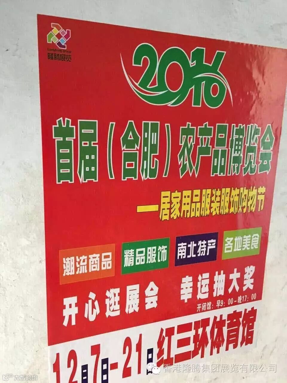 由安徽省现代农业协会主办,隆腾展览公司承办的“首届(合肥)农产品博览会暨居家用品服装服饰购物节”将于12月7日-12月21日(早9:00-晚17:00)在红三环体育馆(马鞍山路与南一环路交叉口)隆重举行。