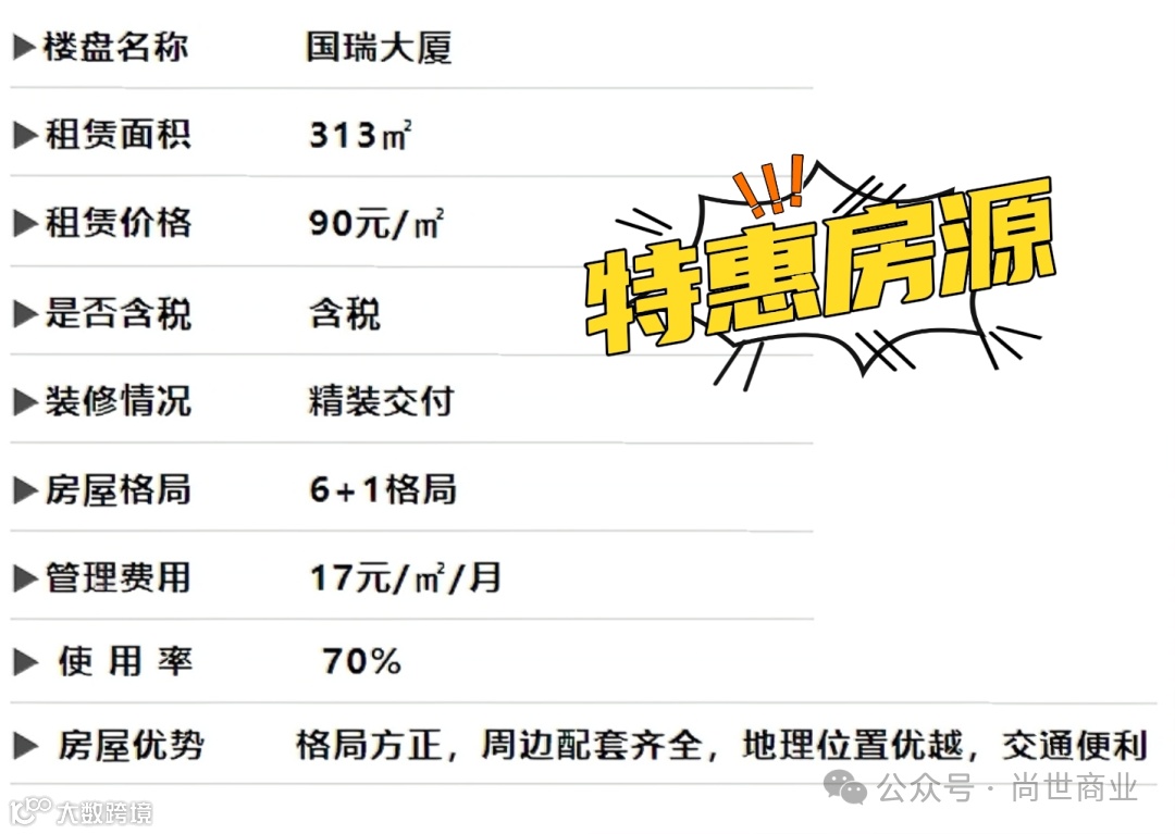 『国瑞大厦』项目总占地面积为26909.08平方米,规划容积率6,总建筑面积约为201880平方米,用地性质为商务办公用地。国瑞大厦由写字楼、商业和酒店三大功能构成,西侧主楼为写字楼,东南弧形建筑为五星级酒店,地上四层联体裙房及地下一层为综合商业。项目采用36部三菱高速电梯,高区电梯高速4m/s,低区电梯高速3m/s,平均候梯时间不超过40s。充分满足写字楼内部交通、实现高效率与高舒适度相结合的商务体验。南北双大堂入户,9.6米超高层挑空中庭,大堂匹配全品牌精装,打造跨国企业商务往来的巅峰形象,彰显企业卓越实力。