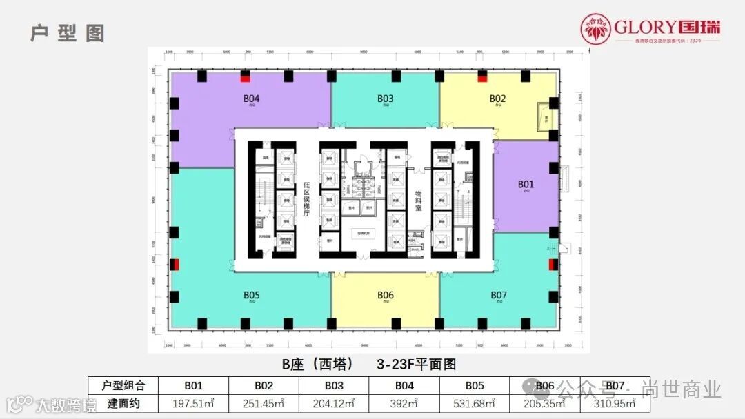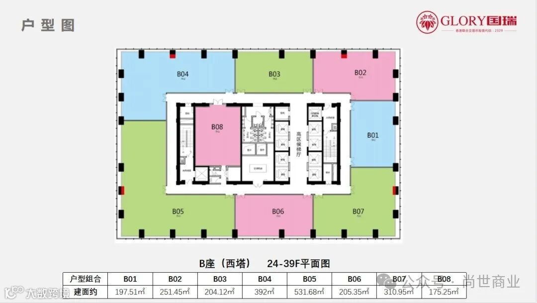 『国瑞大厦』项目总占地面积为26909.08平方米,规划容积率6,总建筑面积约为201880平方米,用地性质为商务办公用地。国瑞大厦由写字楼、商业和酒店三大功能构成,西侧主楼为写字楼,东南弧形建筑为五星级酒店,地上四层联体裙房及地下一层为综合商业。项目采用36部三菱高速电梯,高区电梯高速4m/s,低区电梯高速3m/s,平均候梯时间不超过40s。充分满足写字楼内部交通、实现高效率与高舒适度相结合的商务体验。南北双大堂入户,9.6米超高层挑空中庭,大堂匹配全品牌精装,打造跨国企业商务往来的巅峰形象,彰显企业卓越实力。