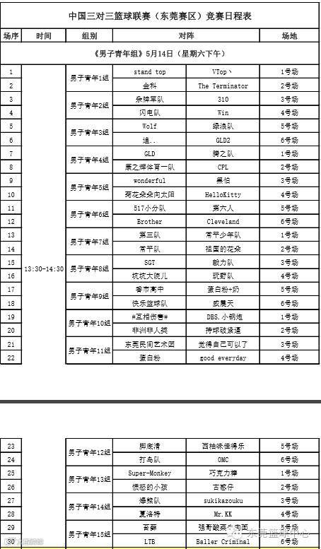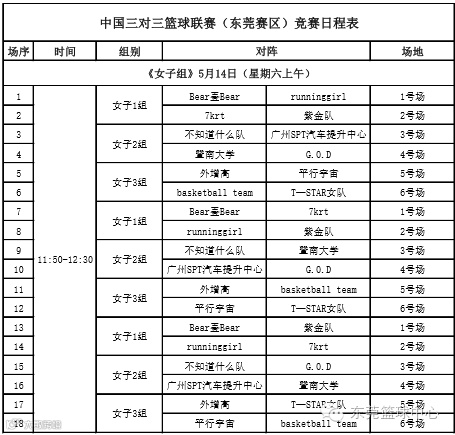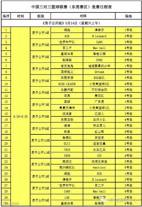 中国三对三篮球联赛(CBA3x3)东莞赛区将于5月14、15日在东风日产文体中心举行,赛区组委会现公示赛程、开赛时间,请各参赛队伍以现有公布的赛程为准。男子公开组、男子青年组各录取3支队伍,女子公开组录取2支队伍晋级广东省级赛比赛。