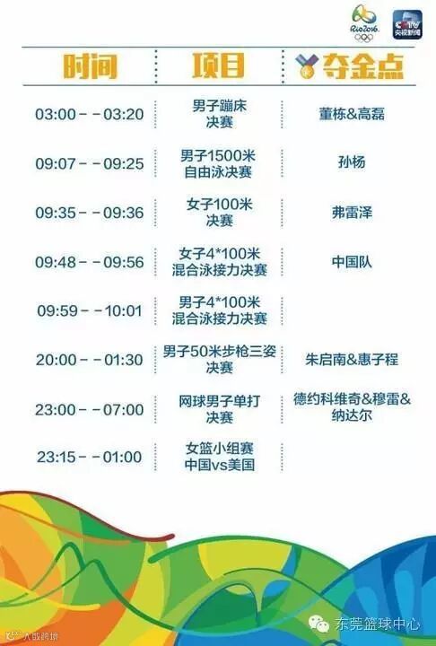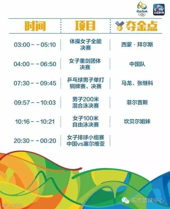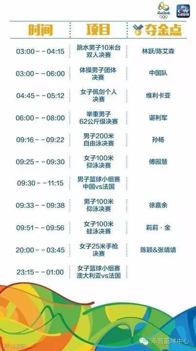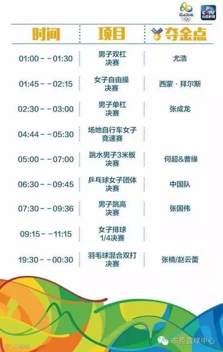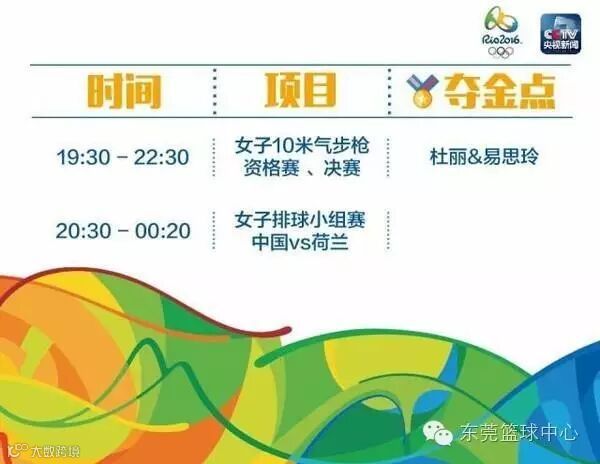 中国队看点:中国射击队的奥运冠军杜丽与易思玲将联手在女子10米气步枪上冲击中国队在里约奥运会的首枚金牌,这也是里约奥运会的首金。 当日,中国女排也将亮相迎战荷兰队,有望迎开门红。