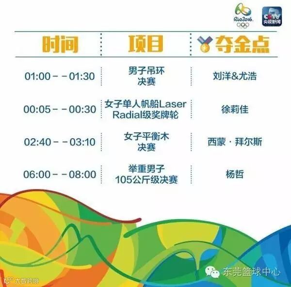 中国队看点:在体操吊环比赛中,小将尤浩和刘洋都有夺牌实力,尤浩是去年世锦赛吊环第二名,刘洋是2014年世锦赛的吊环金牌得主。男子举重105公斤级,身高1米87的壮汉杨哲将成为中国男举亮相奥运赛场最高、最壮的选手,由于主要对手哈萨克斯坦人伊林被禁赛,他的夺冠机会大增;男子三级跳远赛场,今年状态不错的室内世锦赛冠军董斌将有望冲击奖牌。