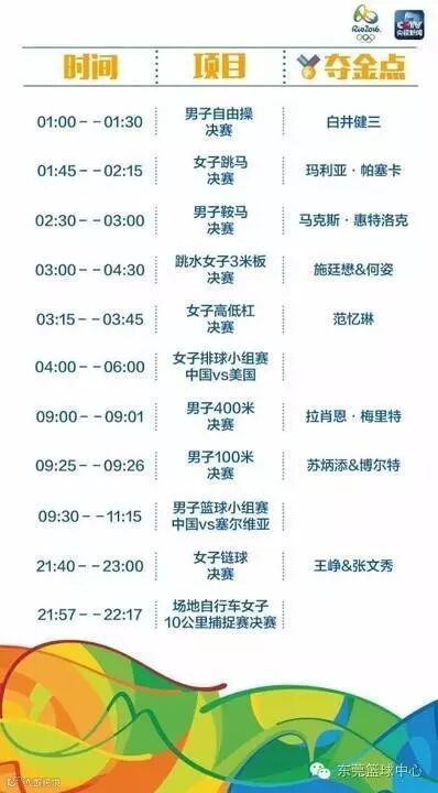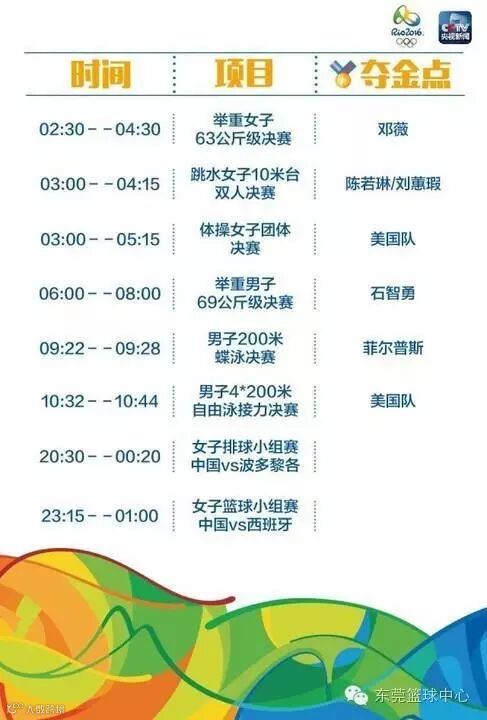 中国队看点:中国跳水“梦之队”将派奥运会“四朝元老”吴敏霞出战女子3米板双人决赛,如果收获跳水里约首金,她将超越邹凯的奖牌数,成为中国体坛“奥运之王”。 另一支“梦之队”——中国女子举重队的黎雅君将出战53公斤级A组决赛,今年4月的全国锦标赛上,她曾以104公斤的成绩打破该级别抓举世界纪录,她或将开启中国女举的包揽模式。此外,伦敦奥运会男子花剑个人冠军雷声将迎来卫冕战。中国女子射箭队将向老对手韩国女队发起冲击。 除了中国队,其它精彩赛事咱也不能错过。小编向您推荐美国队游泳天才莱德基的比赛,说不定会改写奥运纪录。