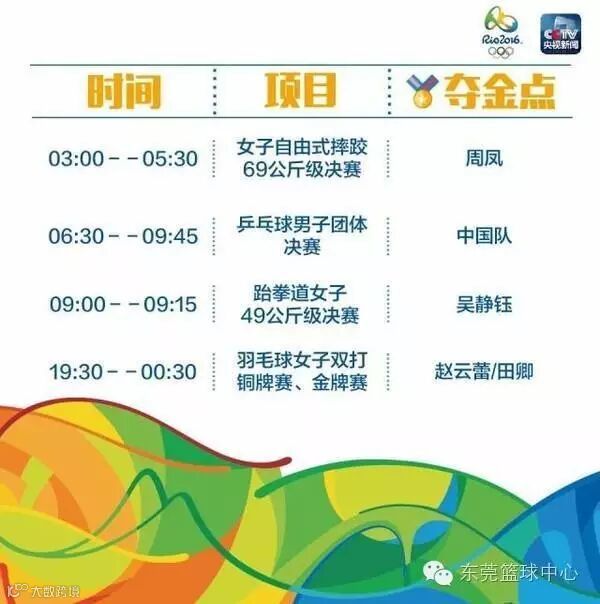 中国队看点:女子摔跤赛场,69公斤级的周凤是冠军的有力争夺者。在今年初的里约测试赛上,她得到冠军,展现出令人期待的实力与潜力。乒乓球男团决赛上演,由马龙、张继科、许昕组成的“最强天团”将力争奥运三连冠;跆拳道女子49公斤级,已实现奥运两连冠的吴静钰,时隔3年后重回世界第一,如果她能成功夺金,将是史上首位三夺奥运冠军的跆拳道选手。