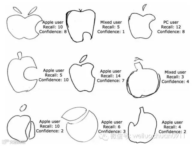 结果发现,尽管被试在进行绘画之前很有自信,但他们的表现却相当糟糕。很多人都在各种细节上犯了错误,比如把原本向内凹陷的底部画成了平底,给苹果加上了原本不存在的果柄,画反了叶子的方向等等。在满分为14分的准确性打分中,被试们平均的得分只有7分左右。这其中,苹果用户的表现稍好一些,但他们的平均得分也只有8.27。只有一人在14项细节特征上都没有犯错,犯错在3处或3处以下的也只有7个人。