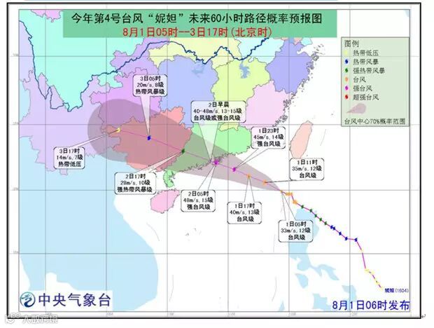 预计,“妮妲”中心将于今天早晨进入南海东北部海面,之后转向西偏北方向移动,强度逐渐增强,最强可达到强台风级(42-48米/秒,14-15级),并将于明天白天在广东沿海登陆,登陆时为台风级或强台风级(38-45米/秒,13-14级)。