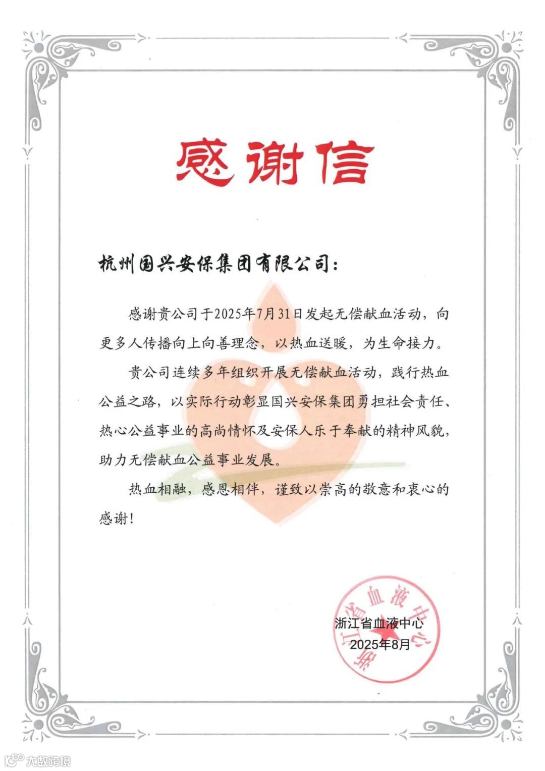 7月31日,公司开展“八一献热血 忠诚护平安”无偿献血活动,40余名员工踊跃参与,并获浙江省血液中心感谢信。(办公室)