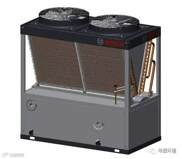 博世空调地暖二合一,主机采用风冷模块机组,采冷媒用的是环保冷媒R410a ,比传统VRV+锅炉系统运行更节能、更环保。