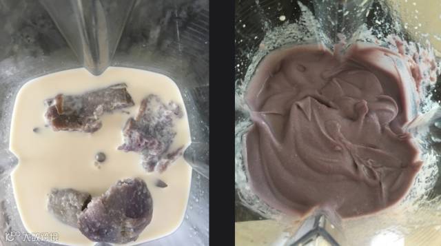 2. 将紫薯掰成小块,与枫糖浆35g、香草浓液1tsp、牛奶200g、盐少许一起放入食品处理机中,搅打至顺滑无颗粒的糊状。取出,入冰箱冷藏1小时