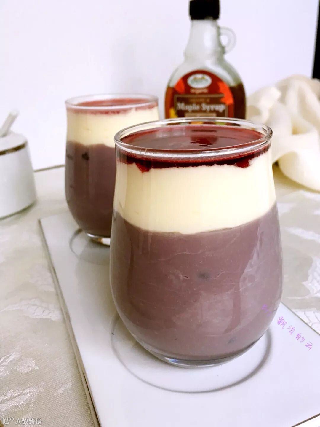 6. 将淡奶油浇在枫糖紫薯浓浆上面,抹平后,再倒入蓝莓酱即可。Enjoy!
