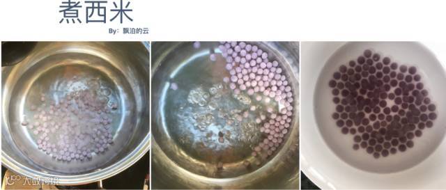 锅内倒入3cup水。煮沸后,倒入西米1/4cup。稍微搅动,待西米浮上水面,盖上盖子焖3分钟。捞出,放入凉开水中过一下,捞起