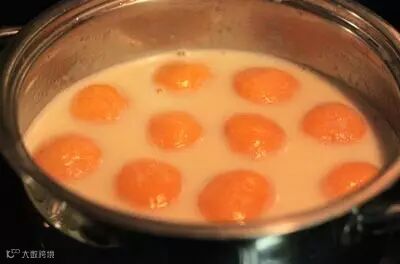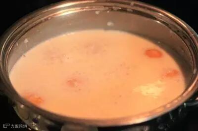 7.将椰奶和3勺白砂糖倒入锅中,煮至沸腾,加入红薯汤圆,用小火煮至汤圆完全吸收糖分。