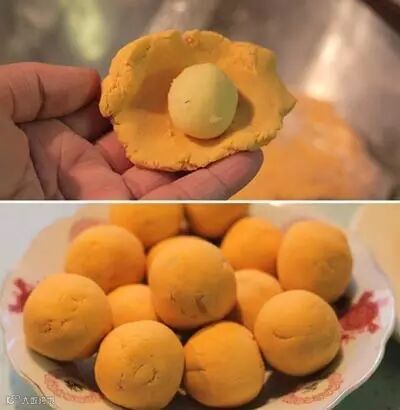 5.将面团切小块,揉成球状,然后将压成饼状,裹上绿豆内陷,全部包好后,就可以准备放入锅中煮了。