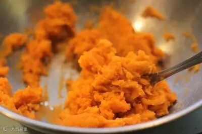 3.将红薯用刷子洗净,放锅中煮熟,然后剥皮,用勺子压成泥状,西米洗净,浸泡在冷水中。