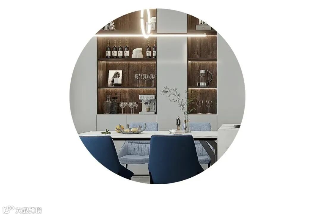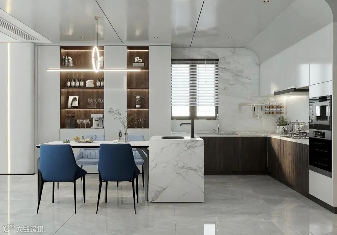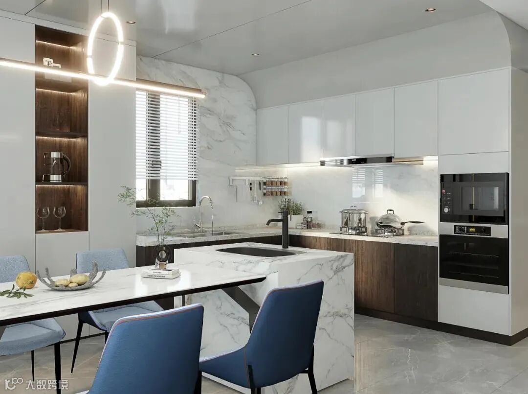 由于面积有限,设计师做了餐厨一体式设计,餐边柜与橱柜相靠,独立的厨房岛台延展出餐桌,烹饪、用餐动线明确流畅,橱柜内嵌冰箱、蒸烤机等家电,为下厨预留出更多活动范围。半开放式餐边柜用岩板、木质、大理石做组合,既能储物也能展示收藏的红酒,配以颇具设计感的吊灯,营造精致优雅的用餐氛围,巧妙地提升了居室格调。