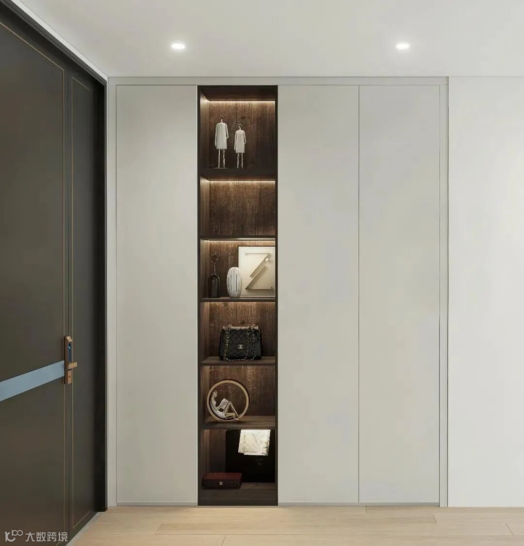 入户处内嵌顶天立地式鞋柜,白色外观大气简约,按压式柜门美观大方;多层展示格用深色点缀,使柜体更有层次感,可以用来摆放装饰品或放置出入需要的小物品。