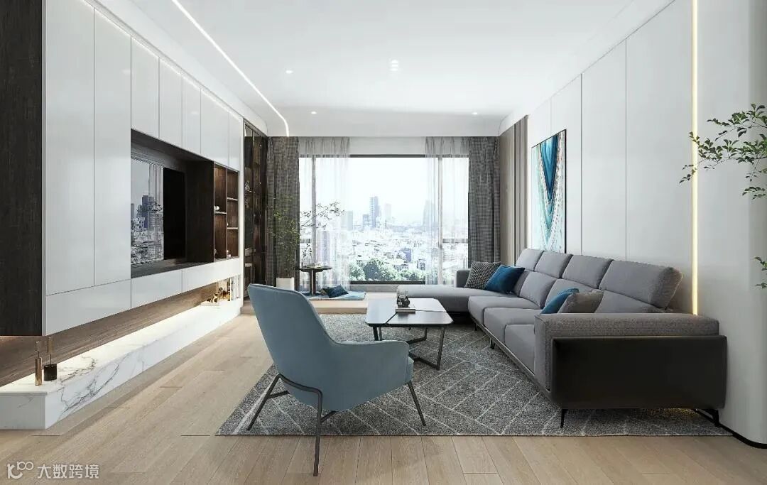 客厅以白灰色为主基调,用水蓝色点缀整体空间,渲染出宁静放松的氛围,清爽干练。