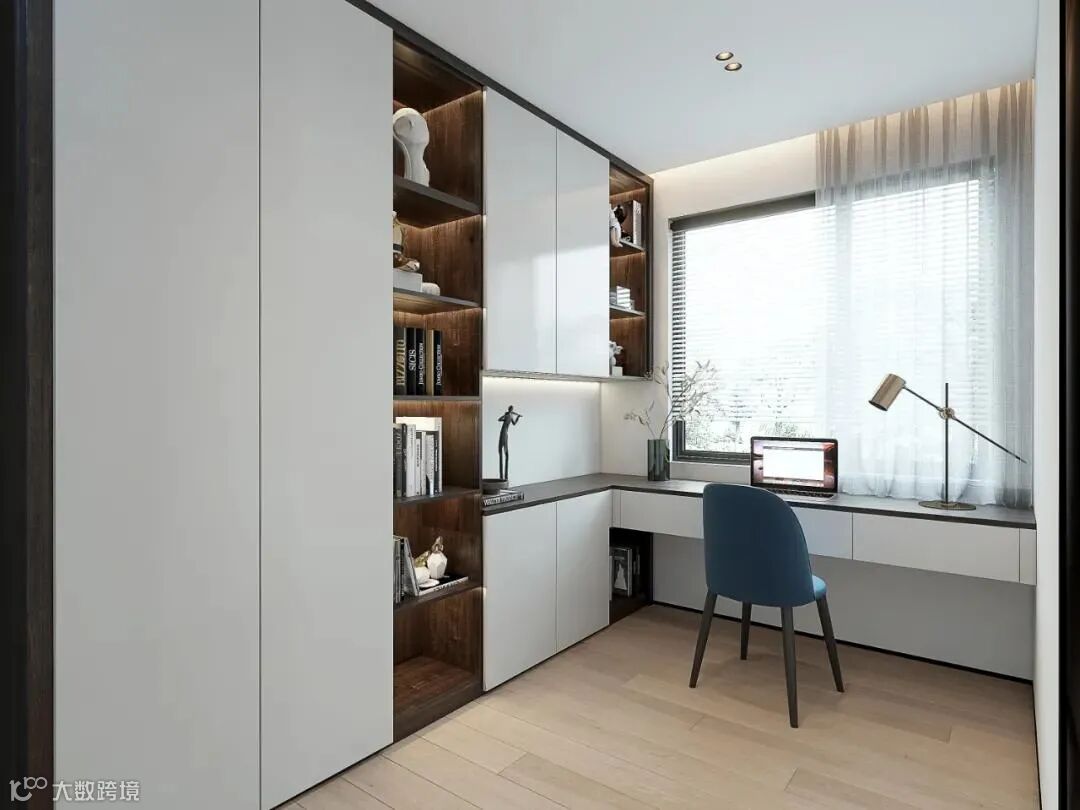 书房面积虽小,但却是姚女士非常在意的办公空间。在这里,设计师靠墙定制整墙书柜,半开放式设计能储物,也能放下姚女士常用的书籍和能带给她灵感的艺术品摆件。