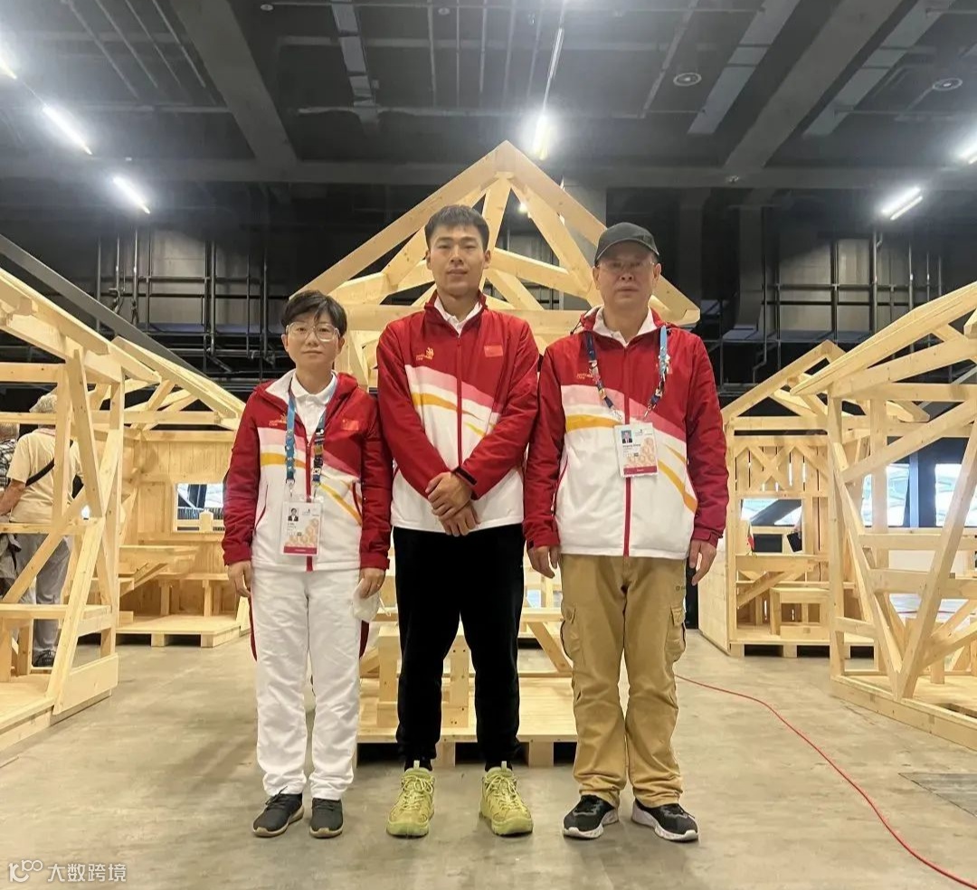 右:精细木工项目技术指导专家组组长 余继宏(东华大学服装与艺术设计学院产品设计系主任)中:精细木工选手 邵茹鹏(上海市城市科技学校教师)左:精细木工翻译 罗占华(中建五局高级技工学校教师)