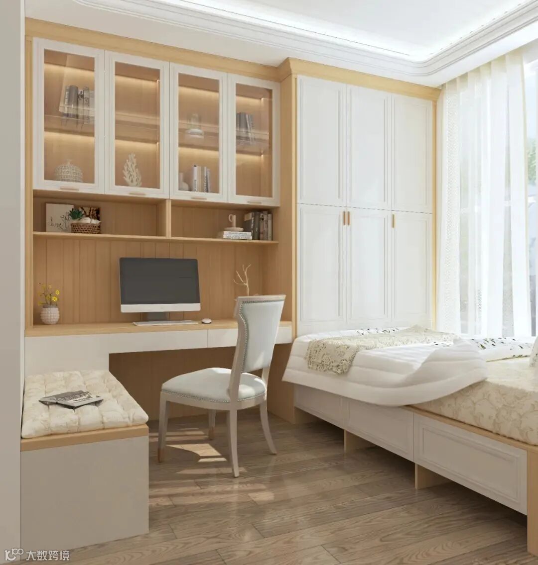 它的功能性这么强,但是对房间的面积大小要求却不严格,就算是在不足10㎡的小卧室中也能完美打造,当然,这样设计还能在最大程度上保证室内空间的统一性,让房间的美观度也UPUP!