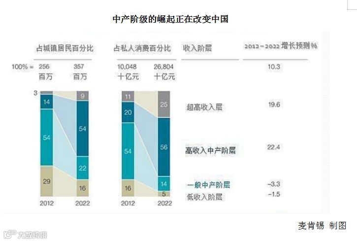 有分析认为,过去12年中,中国蓝领工人的收入增长了8倍,惊人的收入增长,扩大了中国的消费基础,使得消费成为推动经济增长一个最重要的推动力。麦肯锡分析师预计,到2020年中国将有近4亿家庭成为收入在1.6万到3.4万美元之间的“主流消费者”,或者说中产阶层消费者。