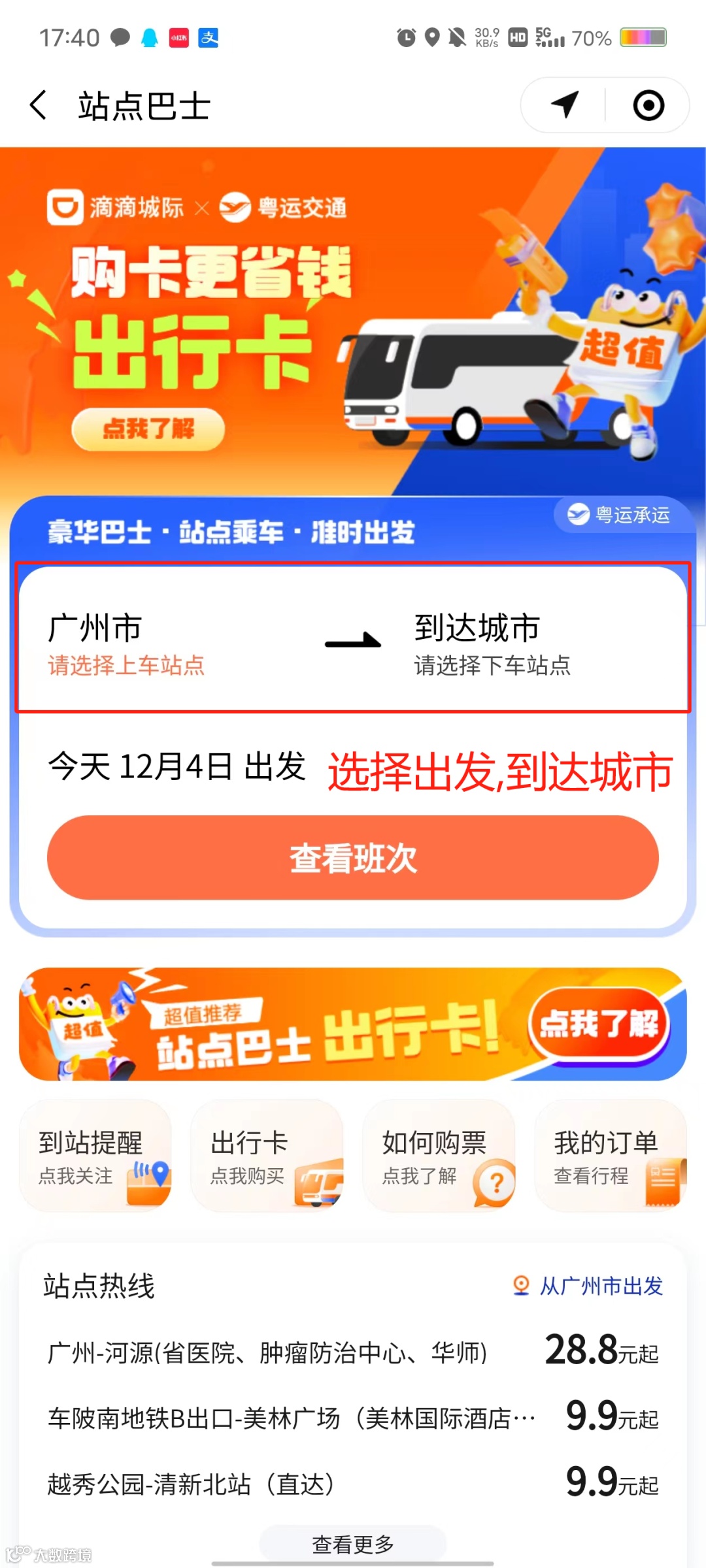 关注“肇庆交运”公众号,点击菜单栏“购票服务”——“站点巴士”处进入购票页面,选择出发和目的地城市,选择合适的线路点击购票。具体班次时间、站点、价格以平台为准