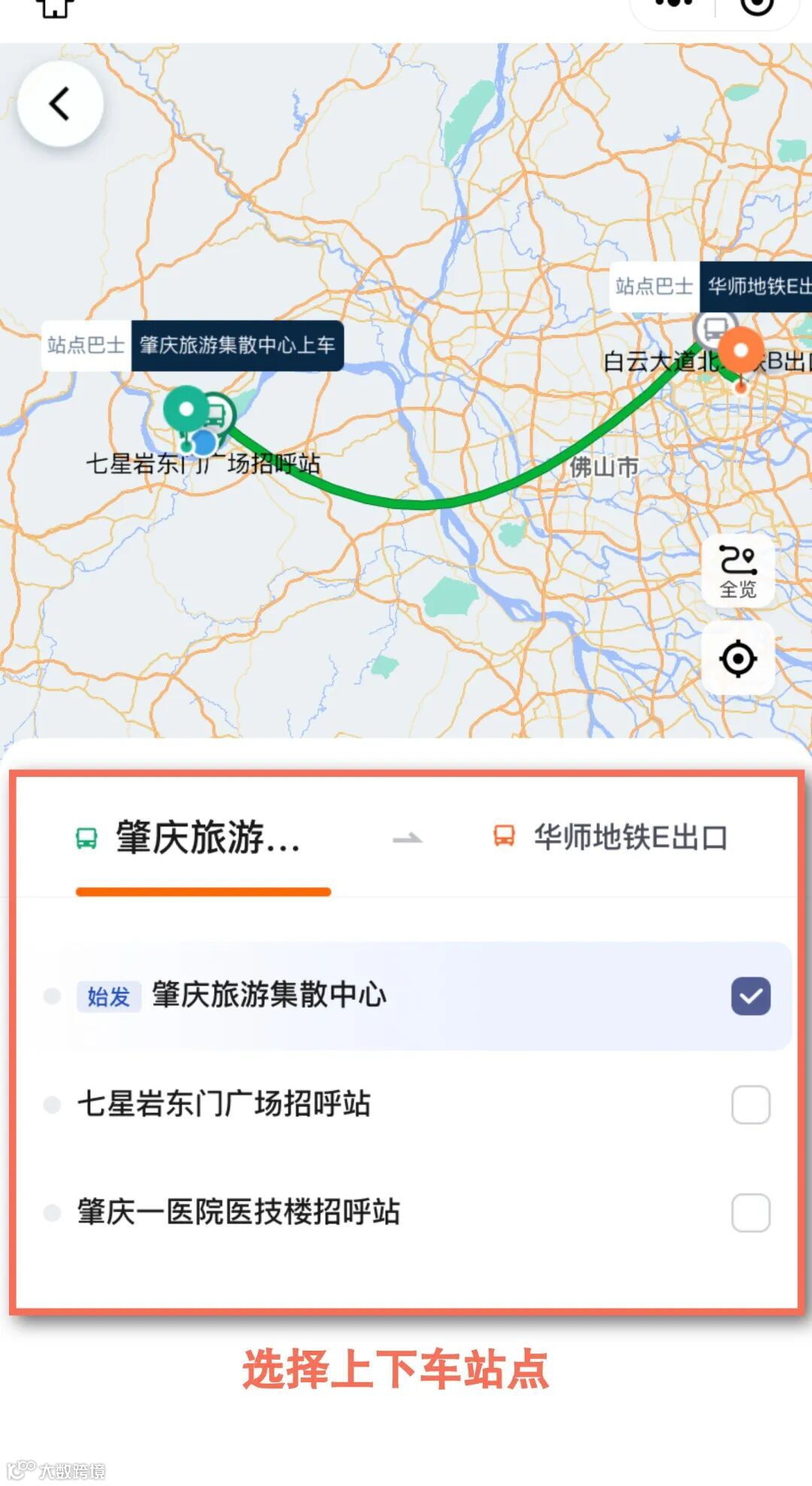 站点设置:华师地铁E出口、白云大道北地铁A2口出、肇庆一院医技楼招呼站、七星岩东门广场招呼站、肇庆旅游集散中心